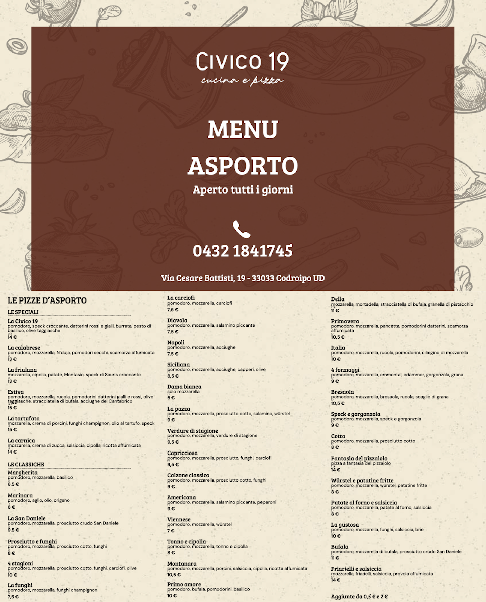 The menu at Civico 19 - Ristorante E Pizzeria stands out for its clear focus on quality, balance, and variety, offering a dining experience that feels both comforting and thoughtfully curated. The pizza selection is clearly the heart of the menu, with signature options such as Pizza Civico 19, Pizza Fantasia Del Pizzaiolo, Pizza Capricciosa, Pizza Della, Diavola, Bufala, Pizza Estiva E Pizza Carnica, and Pizza Quattro Formaggi Con Prosciutto E Salamino, each reflecting a strong respect for Italian tradition while allowing room for creativity in toppings and flavor combinations. These pizzas cater equally to lovers of classic tastes and those seeking bolder, more expressive profiles. The menu is well supported by appetizers that set the tone for the meal, including Antipasti Della Casa, Antipasto Civico 19, Calamari Fritti, Crocchette Di Jalapegno Con Formaggio, Sformatino Di Patate Alla Carnica, and Salmone Affumicato Con Crostini E Burro Salato, which together showcase a range of textures from crispy to creamy and flavors that move comfortably between indulgent and refined. For main courses beyond pizza, Tagliata Di Manzo adds depth to the menu with a more robust, meat-focused option, while lighter accompaniments such as Insalata Mista help balance the overall offering. The drink selection complements the food effectively, with Birra for casual pairing, Prosecco for a fresh and celebratory note, and Espresso Doppio providing a strong, satisfying finish. Desserts are concise but well chosen, with Apfeltorte delivering a sweet conclusion that feels homemade and comforting. Overall, the menu feels cohesive and complete, moving smoothly from appetizers to pizzas, mains, drinks, and dessert, and leaving a strong impression of a restaurant that values consistency, flavor clarity, and an authentic Italian dining rhythm.
